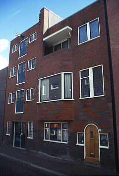In tegenstelling tot het horizontaal gelede woonhuis, is het pakhuis verticaal gericht. Het woonhuis telt drie bouwlagen, waarbij de begane grond vrij gesloten is gehouden. De eerste verdieping daarentegen heeft een groot horizontaal raam. Bij de overgang naar het pakhuis heeft de architect gekozen voor een halfronde vorm die de beƫindiging aangeeft van het woonhuis. Deze vorm is op de tweede verdieping doorgezet in metselwerk en steekt uit boven de daklijst. Dit punt markeert de twee funkties van het complex. Op de tweede verdieping is een loggia aangebracht.