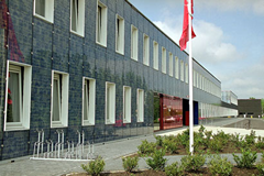 De entrée en verbindingsportaal tussen twee gebouwen zijn geaccentueerd met rode glasplaten in de huiskleur van de Milieudienst.