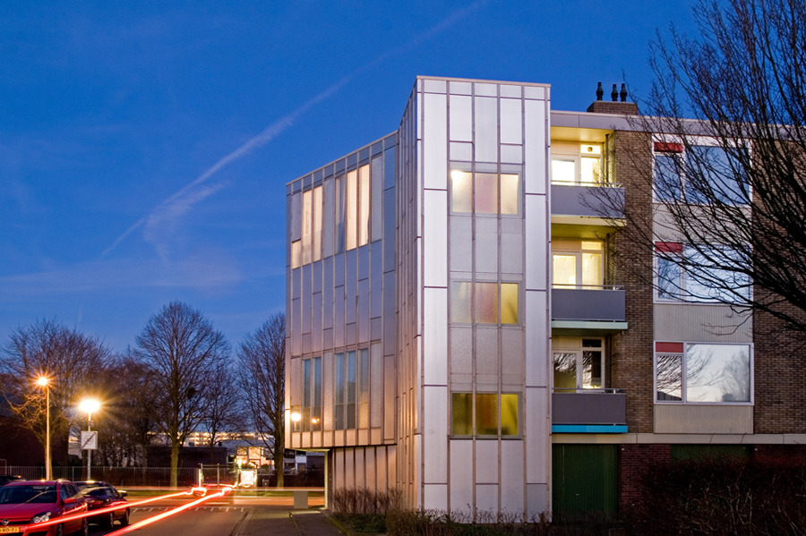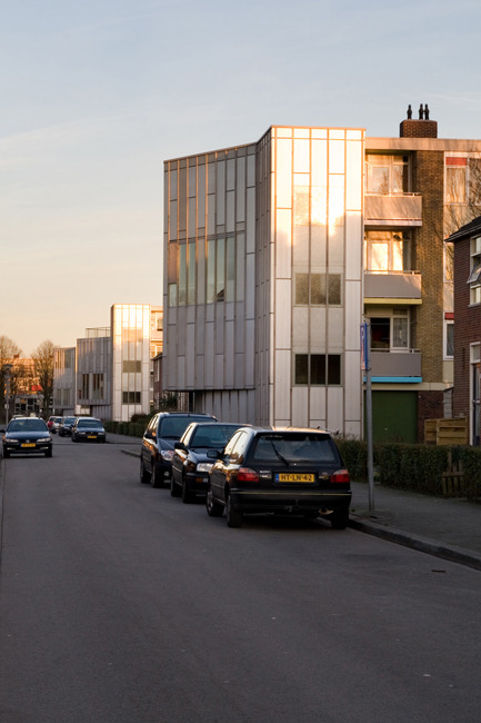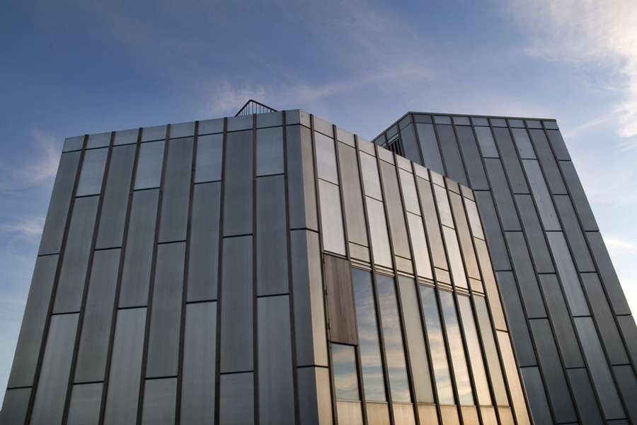 De gevel is vervaardigd uit dunne aluzink staalplaten, afgewisseld met helder en geprofileerd glas en vastgezet met verticale red-cedarhouten latten. Afhankelijk van de positie in de straat verandert de uitdrukking van de gevel.