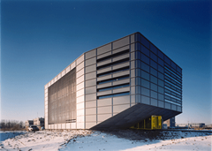 De high-tech uitstraling van het kantoorgebouw past goed bij het imago van de huurders. De vervormde stalen kubus staat als een amorf object in het landschap, waarbij de geel glazen entreepartij onder de bebouwing lijkt geschoven.