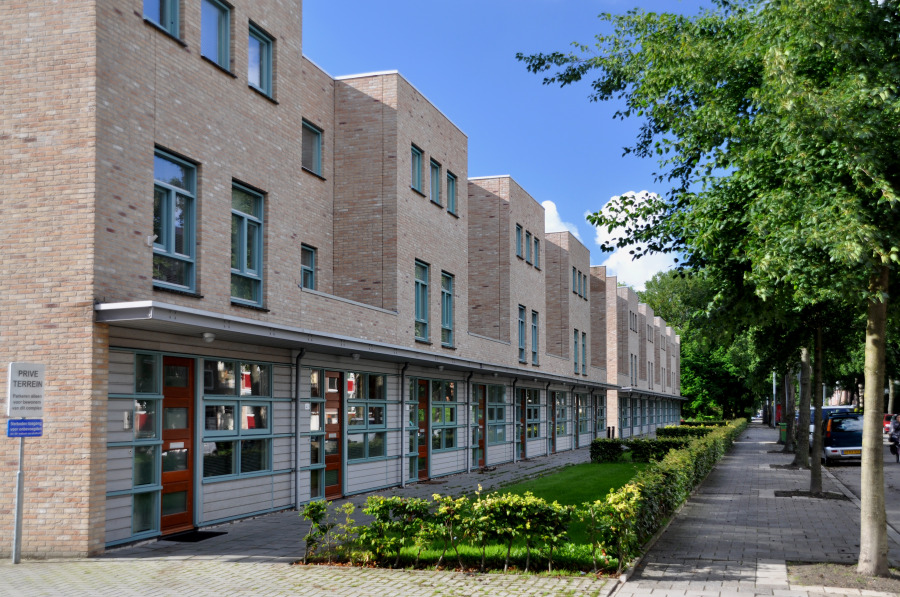 Opvallend zijn de verspringende gevels en balkons die overigens zijn voorzien van ingebouwde bankjes die de plasticiteit van de gevel mede bepalen. Om de hoek, langs de Elzenlaan, zijn de zijgevel van het apparte- mentenblok en de aansluitende eengezinswoningen in een lijn gelegd. Het voorgebied van de rijwoningen en het appartementenblok – een stoep met een groene border – draagt een gemeenschappelijk karakter.