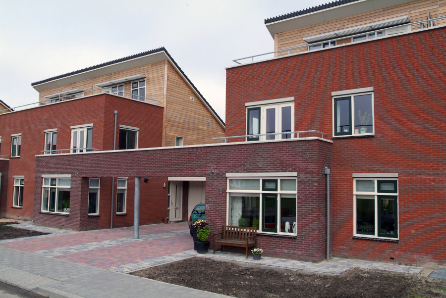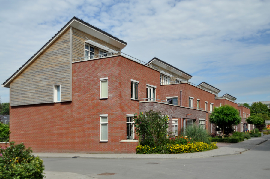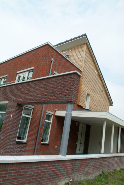 De koppeling middels de gemetselde band zorgt enerzijds voor de gewenste wandwerking, anderzijds voor een geregisseerd eindbeeld waarachter de bewoners alle vrijheid hebben voor het realiseren van o.a. een carport, zonder dat dit het straatbeeld beïnvloedt.