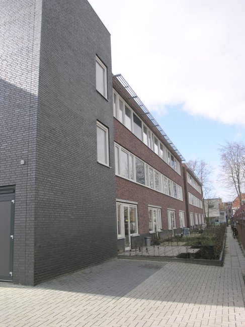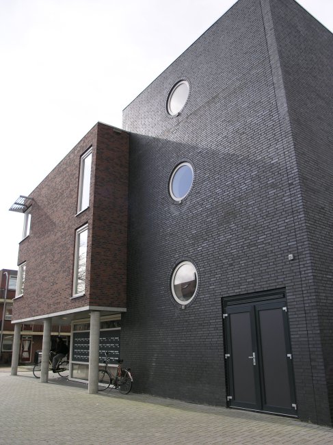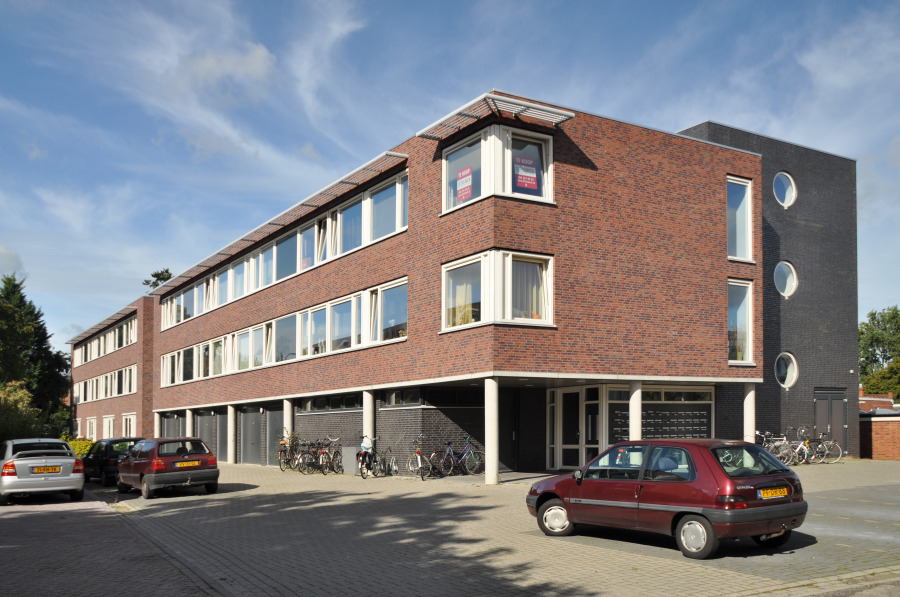 De entree is overdekt door het ‘doorschieten’ van de appartementen op de verdiepingen. Gekozen is voor horizontaal gekoppelde lichtopeningen op de verdie- pingen om de langgerektheid van het gebouw te benadrukken. Het gebouw is uitgevoerd in een rode baksteen – aansluitend bij de Groningse traditie – in combinatie met een zwarte geënrobeerd baksteen voor trappenhuis/ liftschacht en plint.