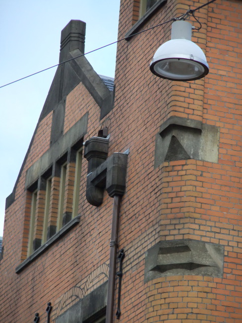 Behalve voor natuursteen heeft Sanders ook gekozen voor oranje verblendsteen. Deze kleur contrasteert met de donkere gebouwen uit de directe omgeving.