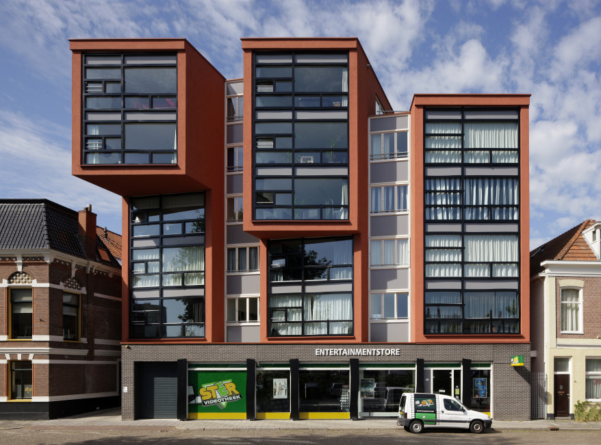 Onder de nieuwbouw van de 14 appartementen bevindt zich een commerciële ruimte waarin de reeds bestaande videotheek geherhuisvest is. Voor de opbouw van het blokje is gebruik gemaakt van de parcellering van de bestaande woningen verderop aan de Damsterkade. Deze ritmiek structureert de verzameling appartementen tot 3 slanke torentjes met tussenleden op een doorgaand basement. De drie gebouwdelen klimmen met het talud van de brug mee omhoog met hun verschillende overstekken, waardoor ze brutaal de wereld inkijken. Dit effect wordt nog versterkt door het toepassen van sterke rode kaders rond totale glasvlakken. De glasvlakken zijn met zware lijnen schetsmatig ingedeeld.
