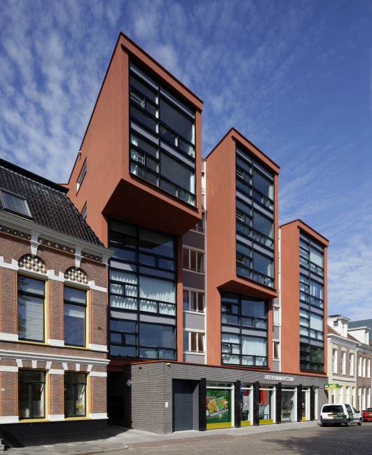 In 2002 kreeg 19 Het Atelier Architecten de opdracht om op de plaats van een voormalige houthandel aan de Oosterhaven een aantal woningen met een commerciële ruimte te ontwerpen. Het voormalige houtpakhuis was in de loop der jaren aan de achterzijde uitgebreid met loodsen tot aan de Damsterkade. Het door de gebouwen ingesloten negentiende-eeuwse woonhuis op de hoek bleef buiten de ontwikkeling.