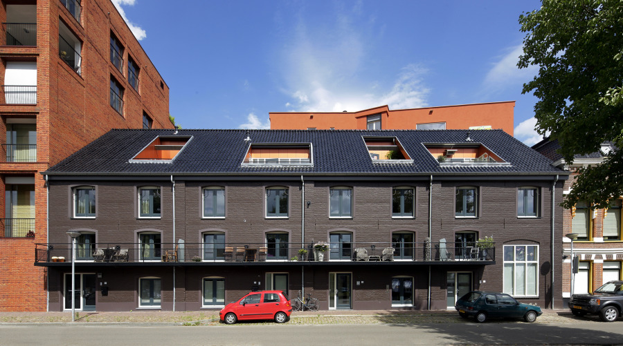 Hoewel de gevels uitgevoerd zijn in stucwerk, zijn ze ‘Gronings rood,’ als hommage aan de eigen kleur van de traditionele, roodbakkende kleiproducten. De glasvlakken van de tussenleden kunnen geheel weggeklapt worden, zodat aan deze zijde extra buitenruimte ontstaat; de buitenste appartementen hebben aan de achterzijde woningbrede balkons. Het binnenterrein is uitermate efficiënt ingedeeld, opdat elke woning over een parkeerplaats en een berging of garage kan beschikken.