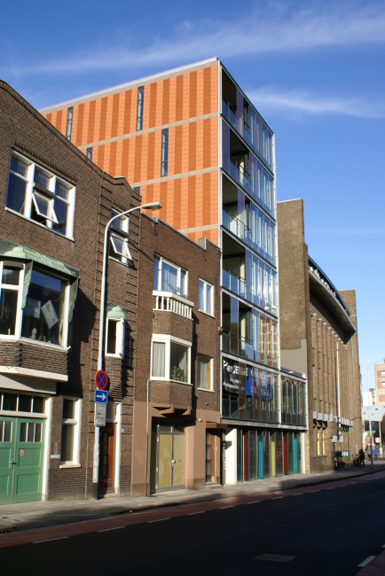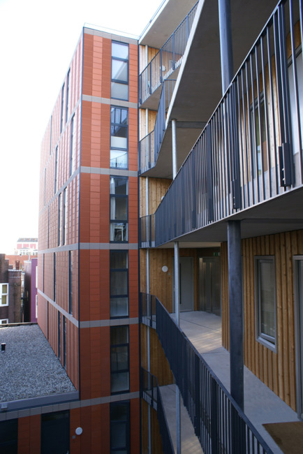 In het ontwerp zijn twee thema’s verwerkt: de open en dynamische sfeer aan de W.A. Scholtenstraat en het intieme karakter aan de Vlasstraat. De gevels, welke opgebouwd zijn uit keramische panelen in twee structuren, zijn een variant op de baksteenarchitectuur in de naaste omgeving. Daar waar de gevel zich aan het binnenterrein opent is de galerijgevel opgevat als een interieurelement en daarom uitgevoerd in hout. Daarbij zijn de akoestische eigenschappen van hout benut om de gewenste demping te realiseren.