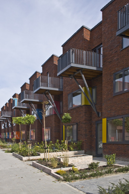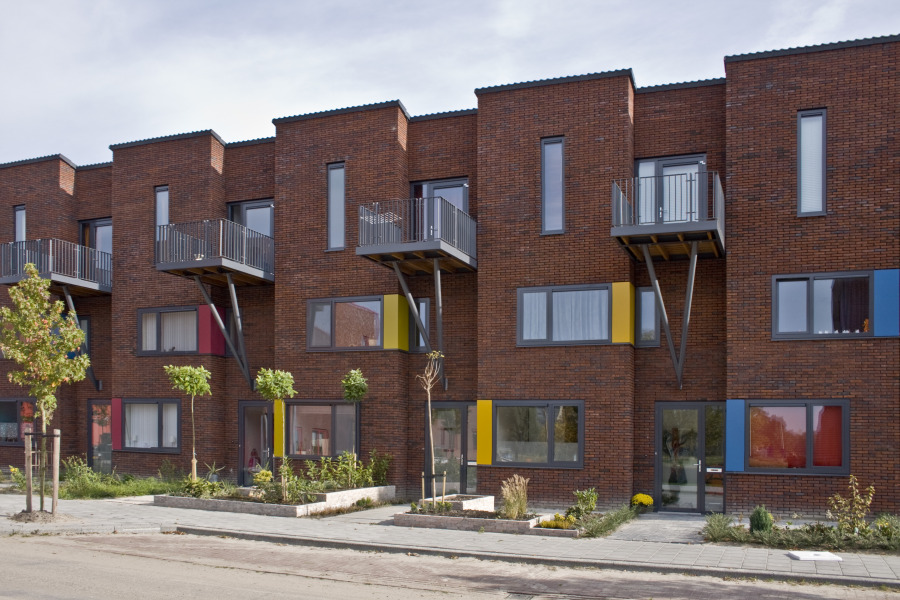 Veel tijd is besteedt aan de keuze van de steen; een metselsteen die past bij het karakter van de overige bebouwing, maar tegelijkertijd de herkenbaarheid van de woningen als geheel benadrukt. Een relatief donkere steen met een sterke nuance is toegepast in beide geveltypen, waarbij de onderlinge verschillen tot uitdrukking komen door een verschillende mix in de bakstenen. Aan de tuinzijde is bij beide typen gekozen voor een combinatie van metselwerk met een lichte materialisering. Aan de voorzijde is gekozen voor een combinatie van metselwerk met aluminium.