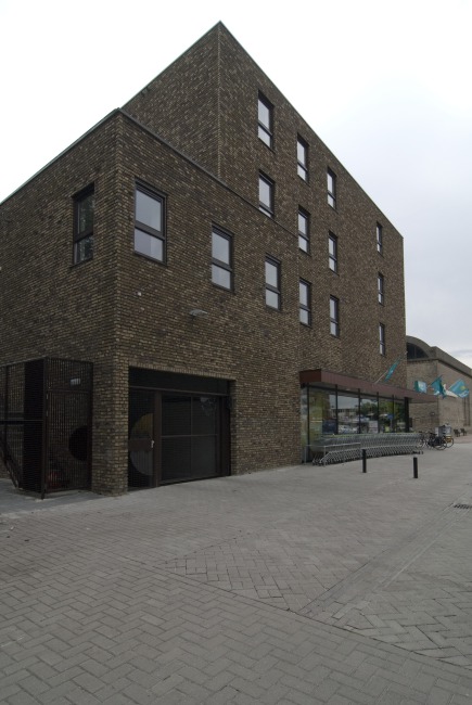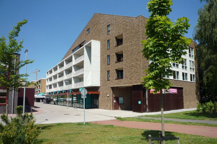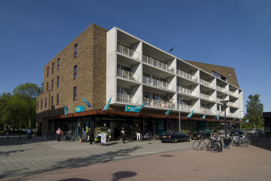 De nieuwbouw van de supermarkt en appartementen refereert aan de zijde van het Overwinningsplein in vorm, materialisering en woningtypen sterk aan de bestaande bebouwing. De supermarkt is als plint vormgegeven en de woninggevels zijn gevat in een groot betonnen kader met balkons. De woningen hebben hun woonkamer over de volle breedte van het balkon, gericht op de kerk en het stadsleven. Aan de zijde waar het gebouw in de groenzone staat, manifesteert het zich veel meer als zelfstandig object, gelijk aan de andere gebouwen in deze zone. De privacy van zowel de bewoners van de apparte- menten als van de naastliggende school, wordt gewaarborgd door de galerij achter een gevel met gemetselde kolommen.