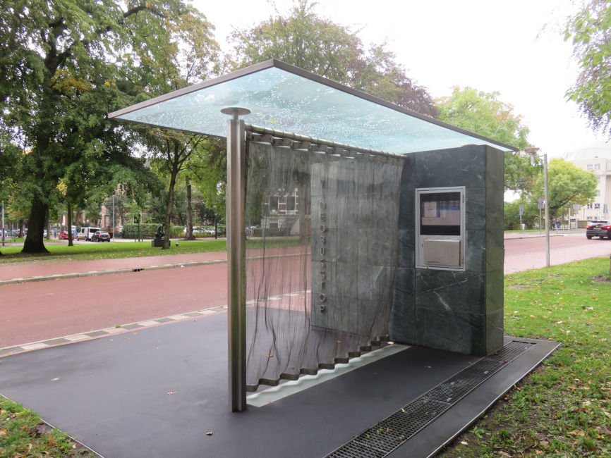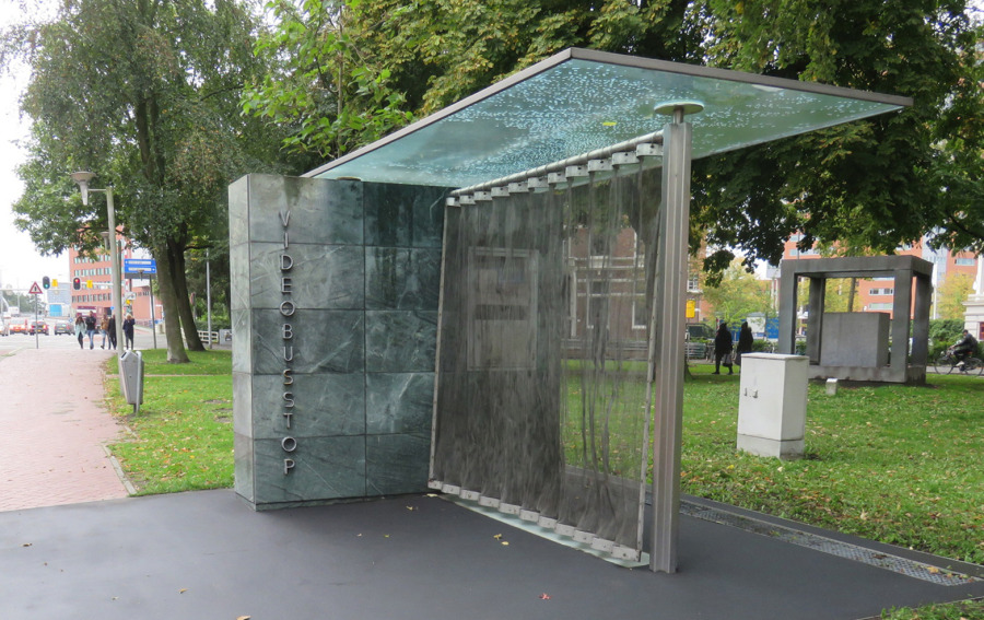 Deze bijzondere bushalte bestaat uit een betegelde muur met dwars daarop een gordijn van staalgaas. Het geheel wordt afgedekt door een glazen dak. Aan de achterkant van het gordijn is een monitor in de wand, waarop videobeelden getoond kunnen worden. Achter op de muur zijn woorden te lezen, die verwijzen naar aspecten van videoclips.