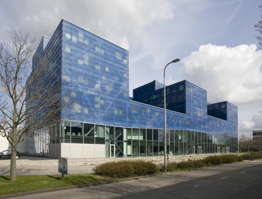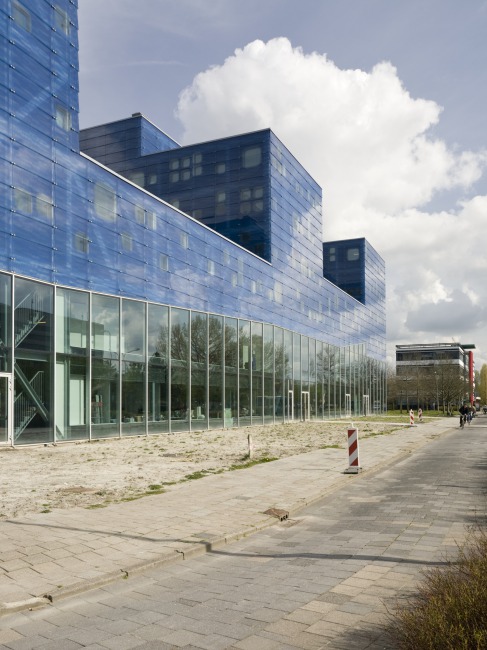 Dit algemene programma is aan de buitenkant zichtbaar achter de volledig transparante plint, die twee lagen hoog is. Daarboven zweeft een groot volume, bekleed met blauw gezeefdrukte glazen panelen, waarin de werk- en onderwijsruimtes van de faculteit gehuisvest zijn. De gevel krijgt diepte door het zicht op de daarachter gelegen constructies en weerspiegelt tegelijkertijd de parkachtige omgeving.
