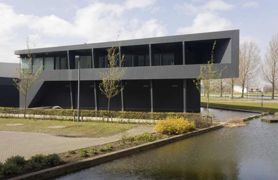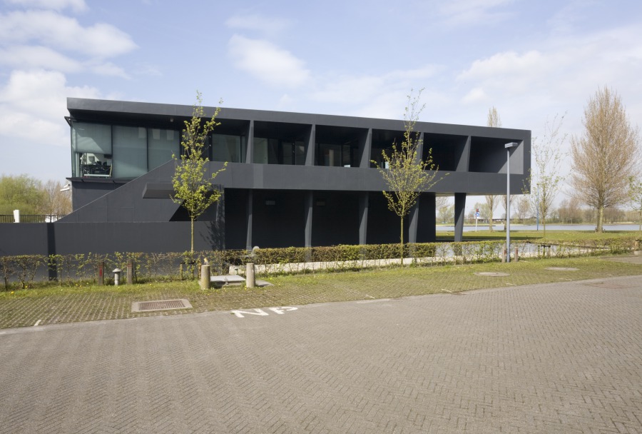 In het ontwerp heeft AAS geprobeerd om het uitgebreide en diverse programma van opslag, stalling, kantoren en kleedruimte die er een plek in moesten krijgen, zoveel mogelijk in een 'architectonische eenheid' te vatten. Die eenheid is vooral te zien aan de materialen: het gebouw is opgetrokken uit een staalconstructie met betonpanelen en houten betimmering, maar in zijn geheel bekleed met een coating van Conipur. Dat is een polyurethaan dat waterdicht is, maar dampdoorlatend. Ook de fors uitstekende raamkozijnen konden met de coating worden bekleed.