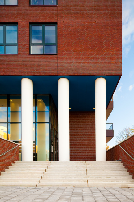 De gevels van de toren zijn uitgevoerd in twee kleuren baksteen, waarbij het donkere vlak naar boven toe telkens ‘getrapt’ smaller wordt en het gebouw zo een slank aanzicht verleent. Centraal in het donkere vlak aan de entreezijde zijn de trappenhuizen gesitueerd, die samen een transparant verticaal element vormen. Op de noordwestelijke hoek ligt, verdiept achter kolommen, de dubbelhoge entreehal, die op ingetogen wijze de symmetrie van het gevelvlak doorbreekt.
