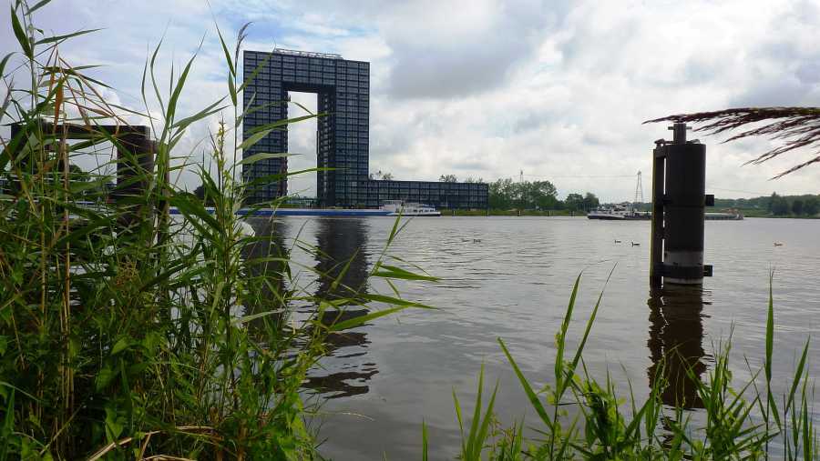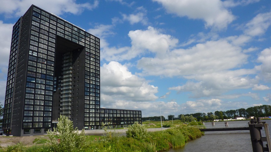De basalten toeslag van de betonpanelen lijkt uit de oeverbeschoeiing voort te komen en vormt een zwart decor tegenover de veelkleurigheid van de omgeving, haar gebruikers, de scheepvaart en de natuur. De halfverdiepte kelder en het dek zijn van schoonbeton en fungeren als een sokkel voor het zwarte gebouw en verzorgen alle relaties met het maaiveld. Net als bij verkeersborden worden rood en wit als kleuraccenten ingezet bij de entree voor de voetgangers en auto’s. Overdag vormt het zwarte gebouw een silhouet tegen de lucht en wordt, afhankelijk van het standpunt, óf een poort vanaf het Damsterdiep (twee losse torens vanaf de Koningsweg) óf een sculptuur vanaf het Van Starkenborghkanaal. In de avond is het gebouw een oplichtend baken tegen de achtergrond van een donkere lucht.