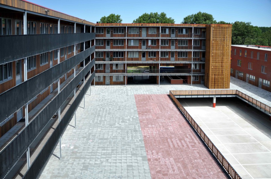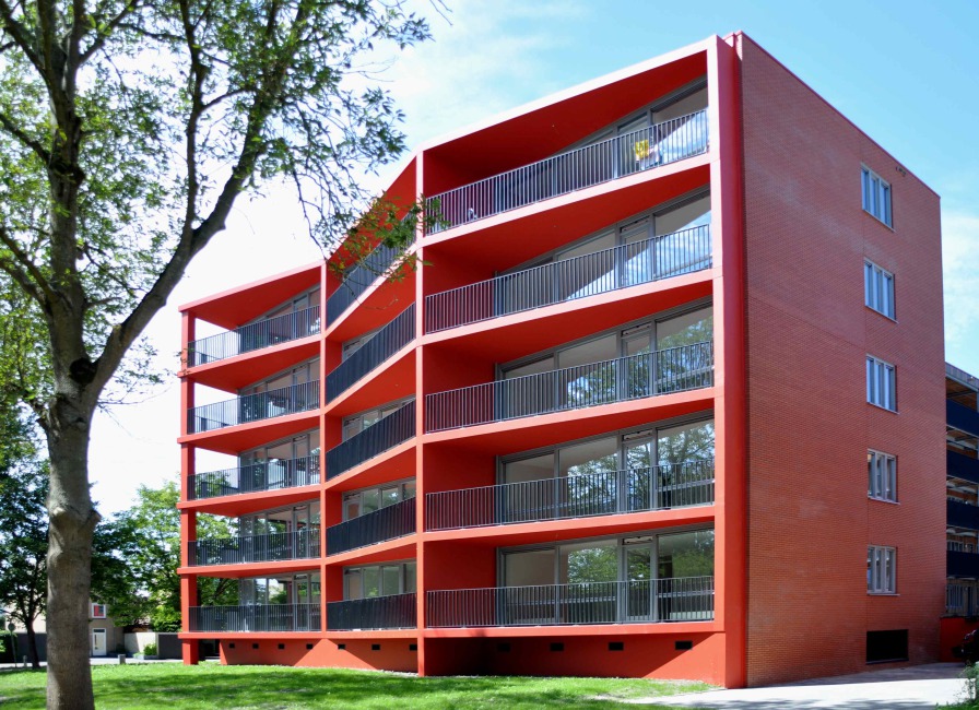 De rijwoningen hebben hun entree aan het binnengebied. De achterzijde sluit aan op de ecologische zone die 90 centimeter lager ligt. Hierdoor kon een hogere woonkamer gerealiseerd worden. Het bouwblok heeft een eenduidig gekleurde buitenzijde. De binnenzijde heeft een natuurlijker materialisatie en kenmerkt zich door soberder kleurgebruik. Dit is goed zichtbaar bij de poorten die toegang bieden tot het openbare binnengebied en de gebouwentrees. De omtrek van de buitengevel van het bouwblok kenmerkt zich door een slingerende lijn. Aan de straatkant liggen de balkons in lijn en slingeren de puien naar binnen toe, waardoor er inpandige afgeschermde balkons ontstaan. Aan de parkzijde slingeren de balkons naar buiten toe en liggen de puien in lijn waardoor er naar buiten gerichte balkons ontstaan. Het gebouw omvat 11 verschillende woningtypen, variërend van appartementen van 80 m2 tot huur- en koopappartementen van 90m2, bijzondere hoekappartementen van 130m2 en dekgebonden gezinswoningen van 135m2. Zo worden binnen één bouwblok verschillende doelgroepen bediend.