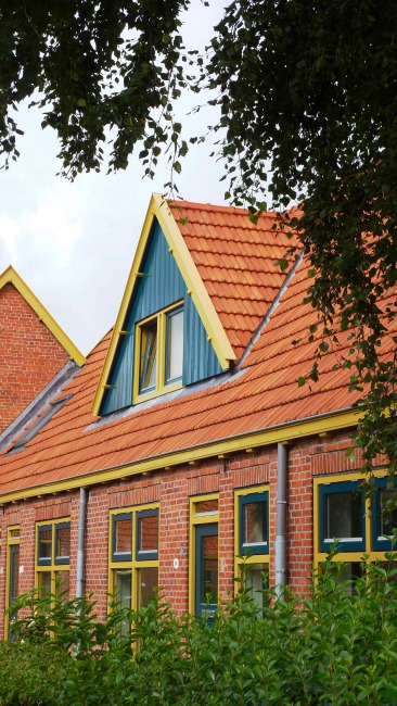 De nieuwe kozijnen zijn voorzien van dubbelglas waarbij de ventilatie wordt geregeld door middel van een kierstand van ramen. Hierdoor wordt het beeld niet verstoord door ventilatieroosters. De nieuwe voordeurkozijnen hebben een abstractie van de oude indeling teruggekregen door middel van een hooggeplaatst vierkant glasvlak. De detaillering van de nieuwe kozijnen, ramen en deuren is modern. De kleurstelling is zo authentiek mogelijk (licht oker en blauw/groen) gehouden en sluit aan op de al gerenoveerde ‘boerderijtjes’.