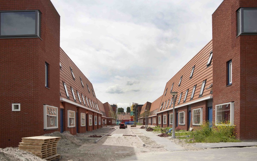 Door de grote kozijnen soms voor, dan weer terugliggend ten opzichte van het metselwerk te plaatsen, ontstaat plastiek en ritmiek in de gevel, dat nog wordt versterkt door de overstekende dakgoten. Op de koppen ontstaat een verbijzondering op de hoek doordat de metselwerk kaders als torentjes omhoog worden getrokken. Zo wordt de hoek gemarkeerd en krijgen deze hoekwoningen een extra kamer. Wat betreft de terreininrichting zijn de bestaande gebakken klinkers en gietijzeren lantarenpalen hergebruikt. Veel aandacht is geschonken aan een zorgvuldige en duidelijke vormgeving van de groene erfscheidingen.