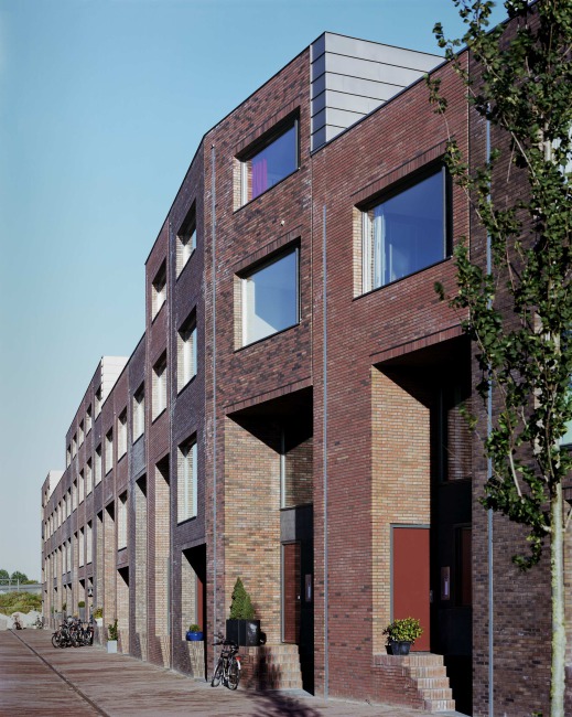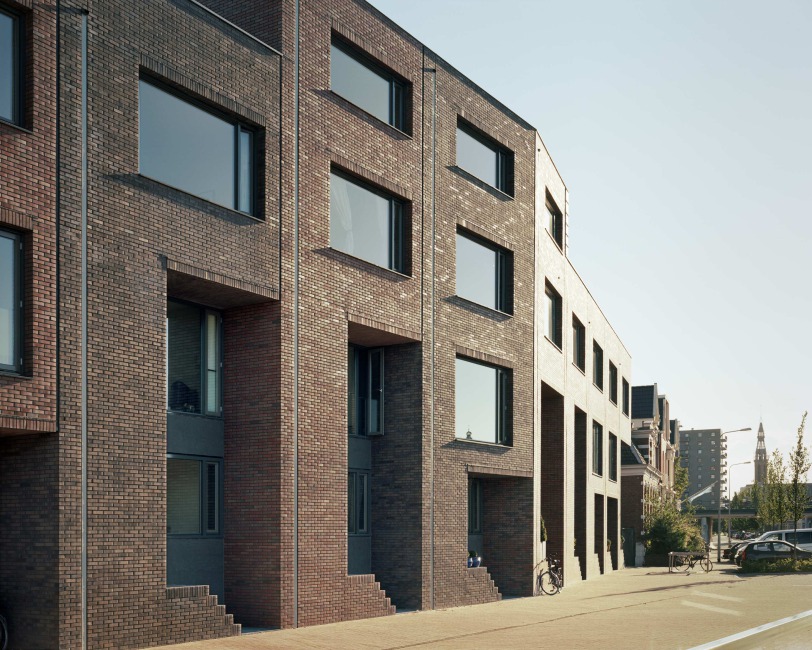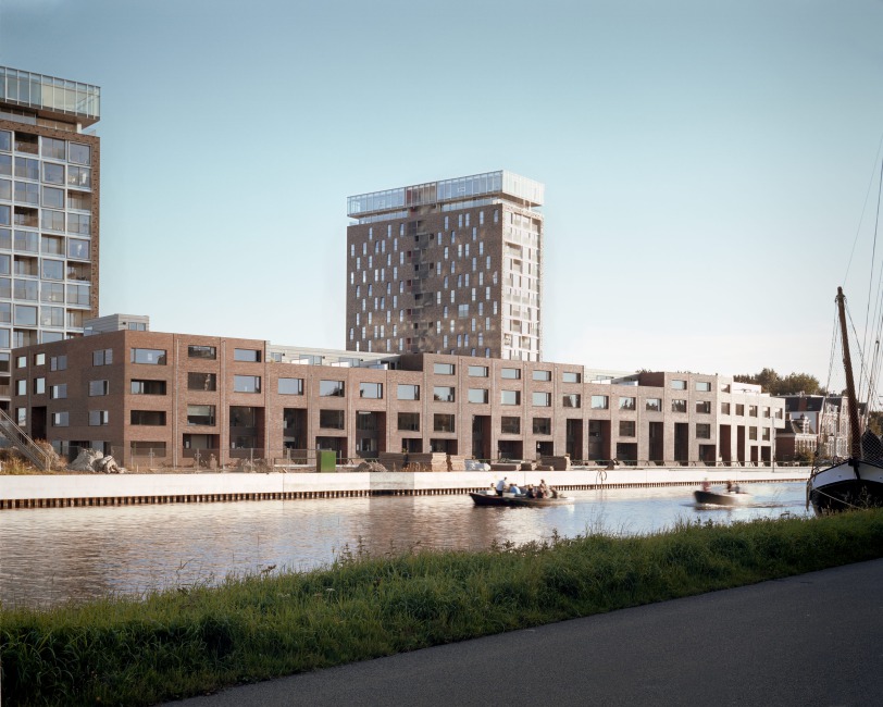 Er zijn aanzienlijke schaalsprongen binnen het bouwblok tussen de appartementen, een ontwerp van Mecanoo, en de grondgebonden woningen aan de kade die werden ontworden door Zecc Architecten.