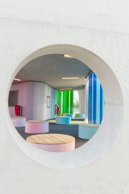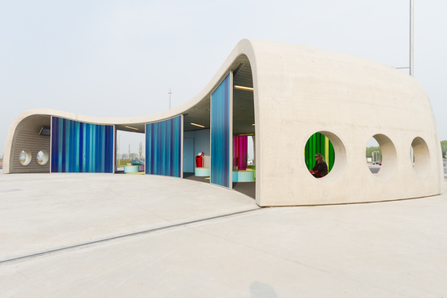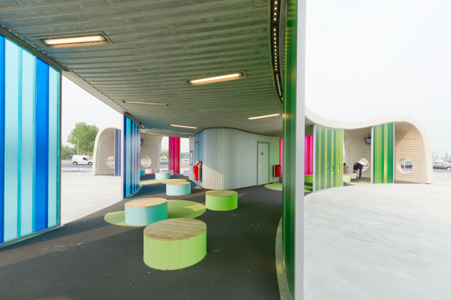 Het gebouw herbergt faciliteiten als een mindervalidentoilet, een technische ruimte en een chauffeursruimte. De koepelvormige betonschaal van het gebouw vormt een sculptuur in het landschap, die aan drie zijden is opengewerkt. Doordat de zijden van het gebouw open zijn, is er veel overzicht en daglicht waardoor een gevoel van veiligheid ontstaat. De zijden zijn deels gevuld met glasprofielen in drie verschillende kleurschema’s, die elk verwijzen naar de drie verschillende rijrichtingen van de bussen. Tegelijkertijd geven de glaswanden beschutting tegen wind en neerslag. ‘s Avonds is het gebouw direct en indirect verlicht waardoor het als een veelkleurige lantaarn oplicht.