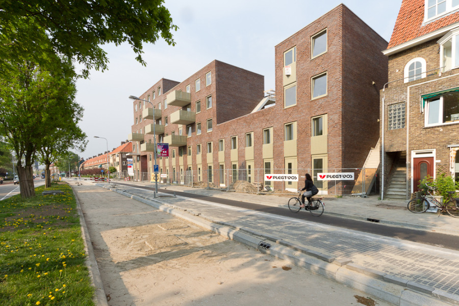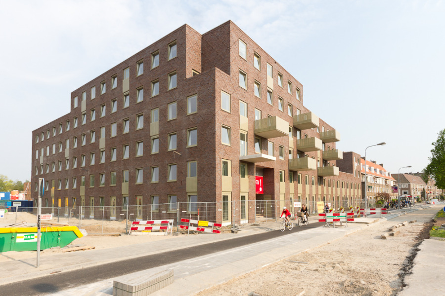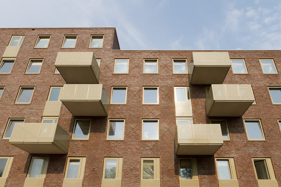De basis voor dit project vormde het beeldkwaliteitsplan van architectenbureau de Zwarte Hond voor de vernieuwing van de Grunobuurt, die in de jaren ‘20 als uitbreidingswijk van de stad werd gebouwd. De opdracht die het bureau Maccreanor Lavington Architects uit Rotterdam meekreeg, was het realiseren van een bouwblok met een mix van typologiën in de koop-, vrije en sociale huursector met daarboven een laag penthouses. Parkeren is mogelijk in de ondergrondse parkeergarage. De textuur van het metselwerkpatroon in de gelaagde gevels grijpt terug naar de baksteenarchitectuur van de oorspronkelijke bouw van de buurt. De raamopeningen vormen daarbij een duidelijke en de verspringende, franse balkons een extra laag. Om aan te sluiten op de bestaande bebouwing is een getrapt bouwvolume gemaakt. De entrees voor de appartementen en penthouses worden gevormd door herkenbare openingen. De grondgebonden woningen hebben elk een entree met een voortuintje met haag en aan de kant van de Paterswoldseweg een dubbelhoge opening. In het binnengebied grenzen de privé-buitenruimten aan de collectieve buitenruimte zodat er een ‘ontmoetingsruimte’ kan ontstaan.