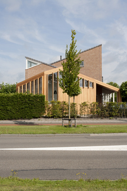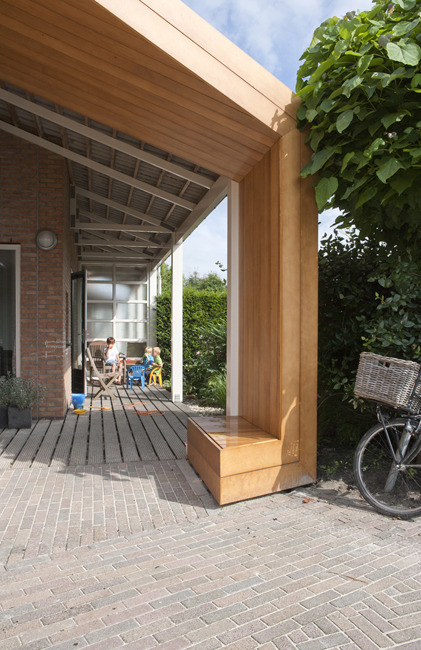 De woonkeuken voegt aan het bestaande huis een lichte, hoge, erkerachtige ruimte toe. De aanbouw bestaat uit een houtskelet, bekleed met accoya houtdelen. Het hout is meerdere keren gelakt waardoor het zijn warme kleur behoudt en bovendien onderhoudsarm is. Het ontwerp oogt transparant, maar zorgt met haar 'lamellen' tevens voor enige privacy.