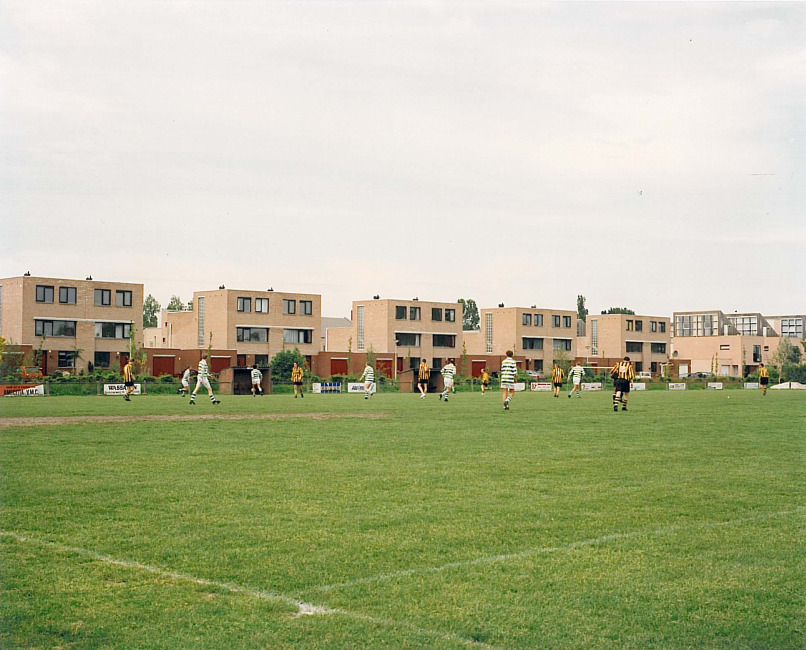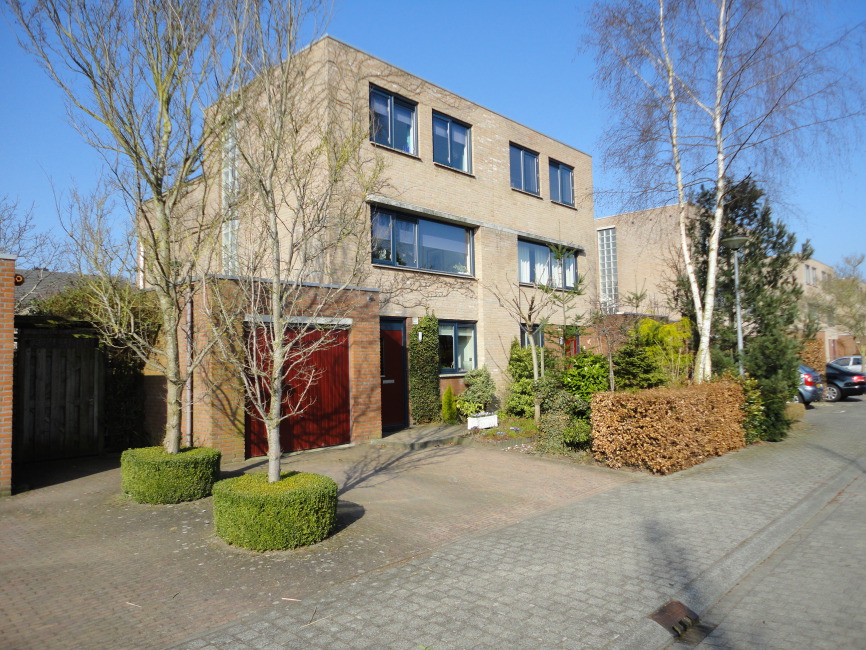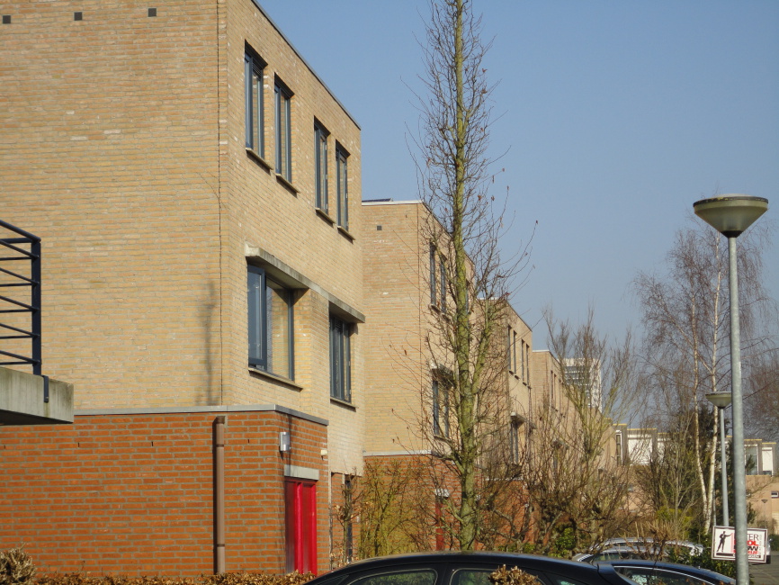 De architectuur is strak en zakelijk. Ze past daardoor prima bij de ernaast gelegen balkon-woningen.