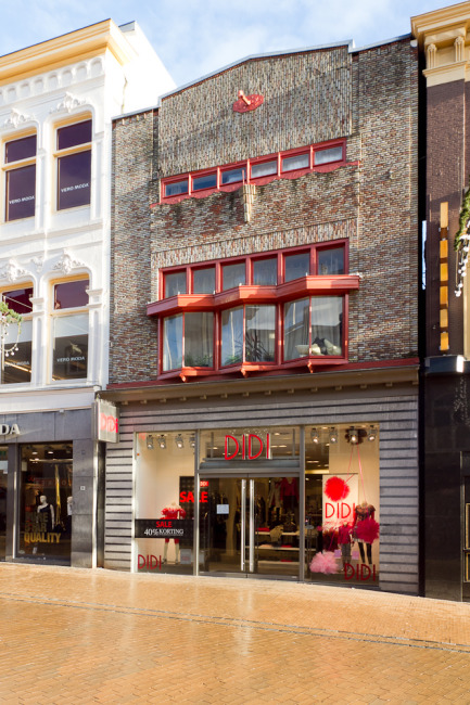 Ook de vensterpartijen op de verdiepingen hebben een bijzondere vormgeving gekregen. Zo heeft de architect gekozen voor harmonicavormige vensters. Boven de lijst met dezelfde vorm zijn zes bovenlichten geplaatst. In het begin van de jaren zestig van de twintigste eeuw zijn de bruine bakstenen één voor één geschilderd in verschillende pasteltinten waardoor het decoratieve karakter nog extra werd versterkt.