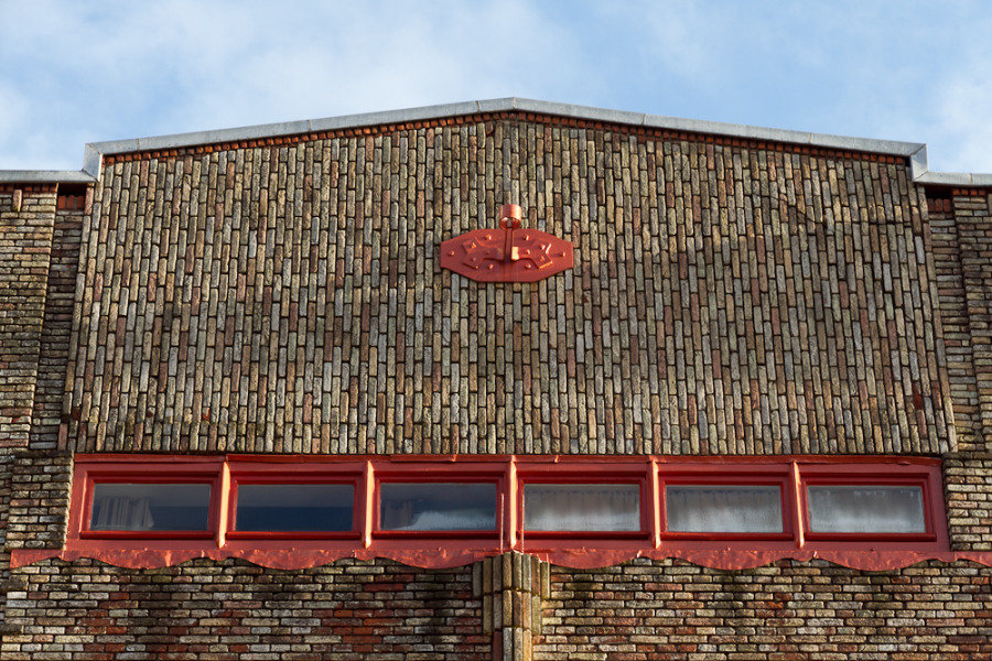 De gevel is symmetrisch opgebouwd, waarbij verschillende metselverbanden zijn toegepast. Zo zijn de bakstenen boven de strook vensters op de tweede verdieping verticaal geplaatst, het zogenaamde staand metselverband. Dit gevelvlak wordt nog extra benadrukt door het boven de dakrand uit te laten steken. Een gemetselde vlaggestok in de vorm van een afhangende kegel markeert dit onderdeel nog eens extra.