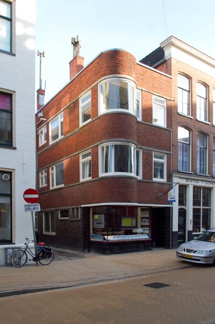 De ontwerper heeft voor een portiek-ontsluiting gekozen. De winkelpui bestaat uit een portiek en een raam dat op beide straten geöriënteerd is. Voor de bekleding heeft de ontwerper zwarte tegels gebruikt.