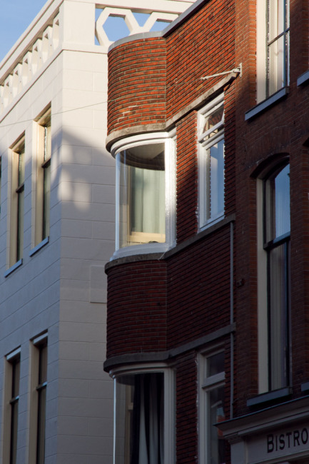 Een smal maar diep pand gebouwd op een rechthoekig grondplan. Opmerkelijk is de halfronde erker op de verdiepingen, die de nadruk legt op het smalle zijstraatje.
