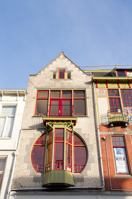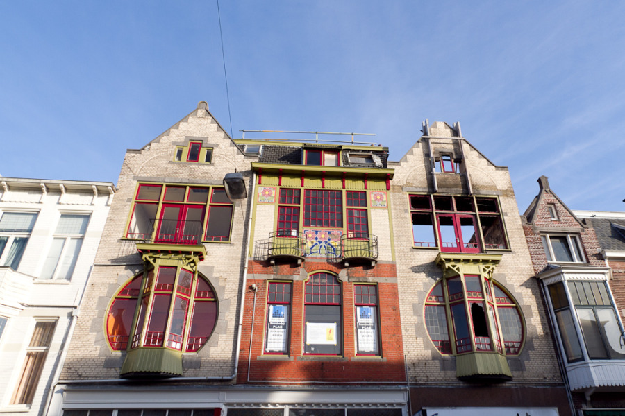 Karakteristiek voor deze Jugenstil-panden zijn de cirkelvormige vensters met de daarin opgenomen trapeziumvormige erkers van de twee identieke panden. De getrapte topgevel wordt afgedekt door natuursteen. Het middelste pand heeft nog een fraai tegeltableau met bloemmotieven.