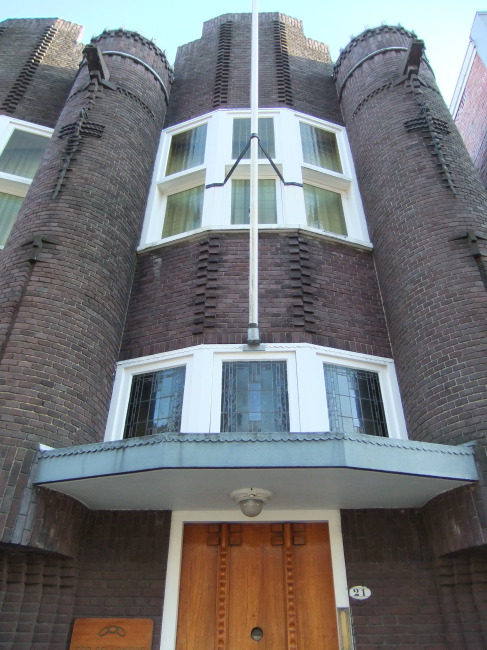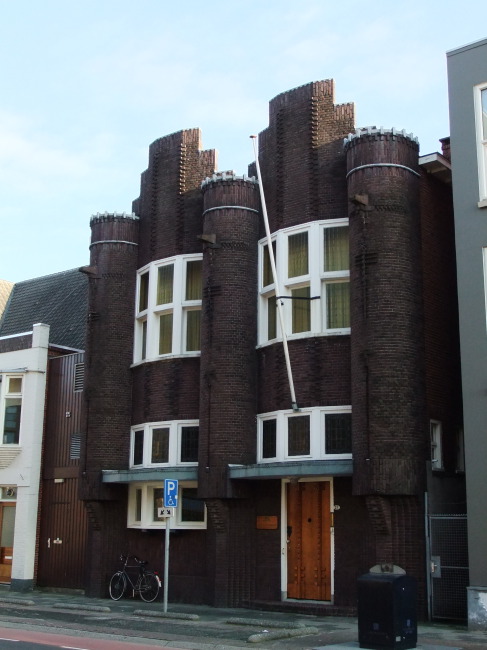 De voorgevel is uit donkere bakstenen opgebouwd; op de dakrand zijn twee getrapte muurvlakken geplaatst. Het front heeft op sommige plekken siermetselwerk. Bovendien zijn aan de drie pilaren onder de dakrand ornamenten aangebracht. De ramen zijn voorzien van glas-in-lood. Een fraaie deur geeft toegang tot het gebouw. De bovenste bouwlaag is ondiep, wat aan de zijkant goed te zien is.