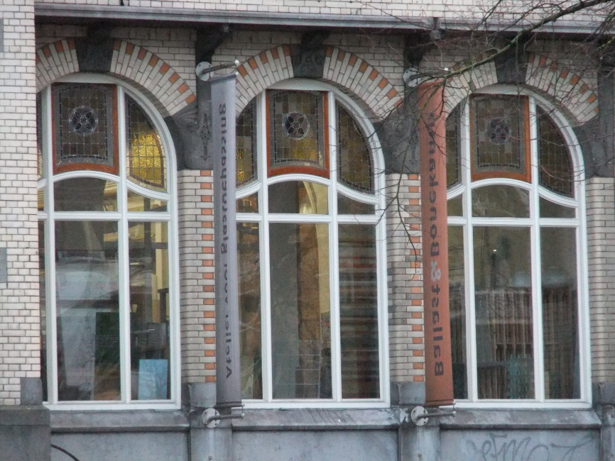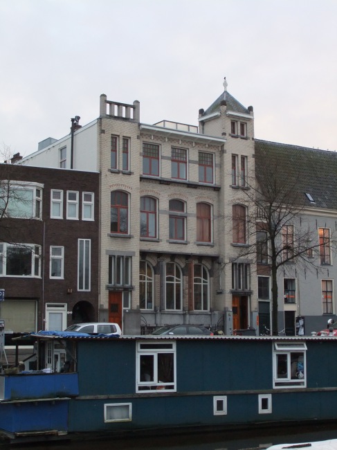 De bel-etage heeft drie grote rondboogramen die zich over de hele breedte van het gevelvlak uitstrekken. Zodoende ontstaat er een wand, die bijna geheel uit glas bestaat en alle aandacht vraagt. De woonverdiepingen daarboven hebben een meer gesloten karakter. Hoewel de opzet van het pand symmetrisch is, wijkt de vormgeving van een van de torens van deze spiegeling af. De rechtertoren heeft namelijk een extra verdieping. De voorgevel is vijf traveen breed waarvan de middelste drie traveeën terugspringen; het souterrain en de begane grond zelfs meer dan de verdiepingen.