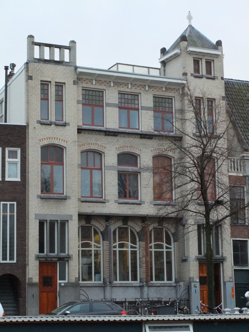Het souterrain is bekleed met natuurstenen platen en heeft een smeedijzeren hek met Art Nouveau-motieven ervoor geplaatst. Het opgaande muurwerk van de voorgevel is opgemetseld uit witte verblendsteen en op de constructieve plaatsen verzwaard met natuurstenen elementen. De zijgevels die boven de naastgelegen panden uitsteken, zijn grof gepleisterd.