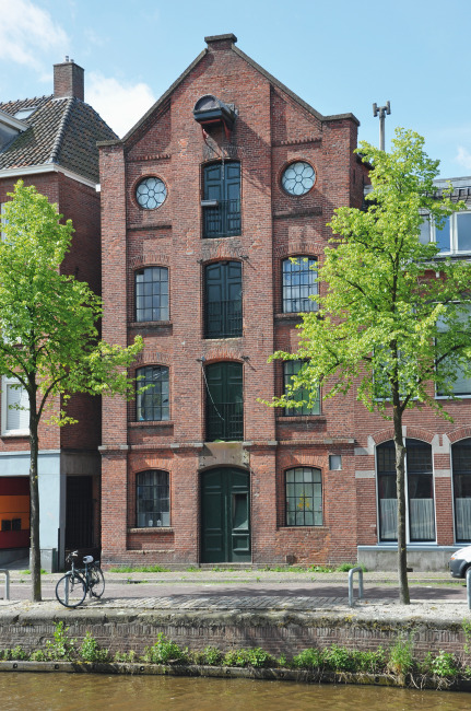 Het gebouw is opgetrokken op een rechthoekige plattegrond en telt vier bouwlagen onder een zadeldak. De voorgevel is drie traveeën breed en opgetrokken uit donkerrode baksteen. De middelste travee bevat de hijsdeuren. Tegen de geveltop is een houten trijshuis aangebracht. De gevelhoeken zijn tot lisenen uitgemetseld. De middelste travee heeft dezelfde dikte gekregen als de gevelhoeken, waardoor de raamtraveeën terug lijken te liggen.
