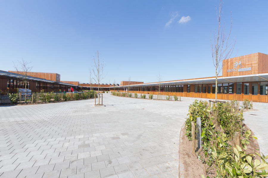 Omgeven door water, is de vensterschool een waar leer- en speeleiland. De aaneenschakeling van lokalen, iets opgehoogd, omzoomt het schoolplein dat letterlijk en figuurlijk het hart van het complex vormt. Het gebouw heeft een ronde vorm die het binnenplein definieert. De circa 400 leerlingen hebben er volop ruimte om in een beschermde omgeving te spelen, omgeven door groen en bomen.