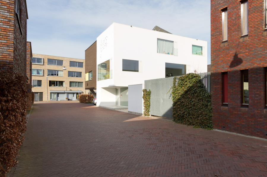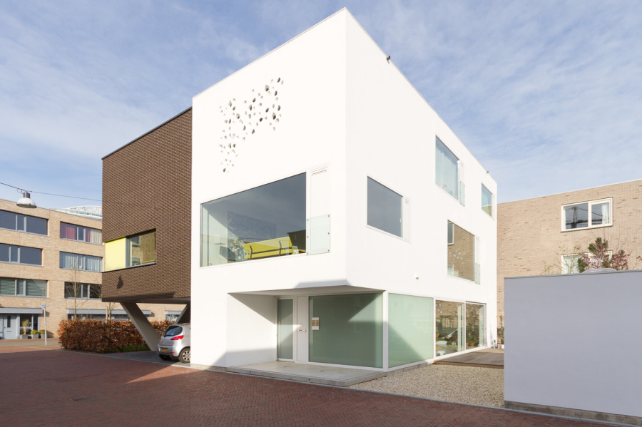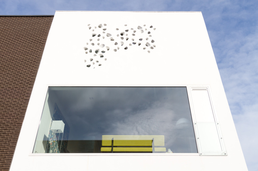 De gevelvlakken die op de publieke ruimte zijn gericht, zijn met organische uitsparingen in het beton geperforeerd. Door schuine insneden treedt het daglicht op een verrassende manier het woonhuis binnen. Ieder moment van de dag toont het gevelbeeld zich in een andere licht/schaduwsituatie. 's Avonds richt ditzelfde lichtspel zich naar buiten toe. De zonnepanelen op het dak voorzien het huis van warm water en verwarming. Daglichttoetreding heeft de grootste prioriteit, ook als bron van passieve warmte. Het gehele huis is voorzien van led-verlichting.