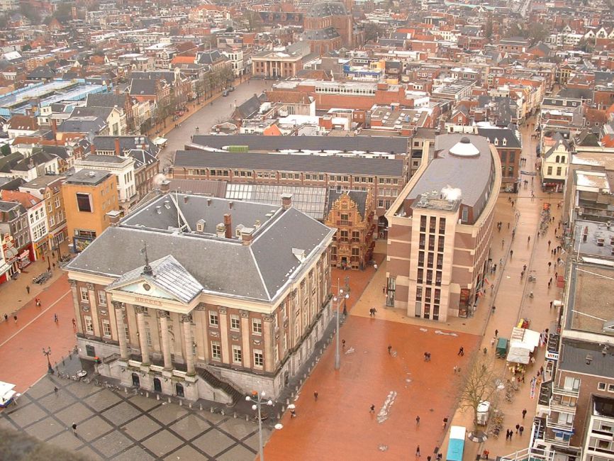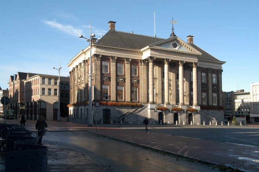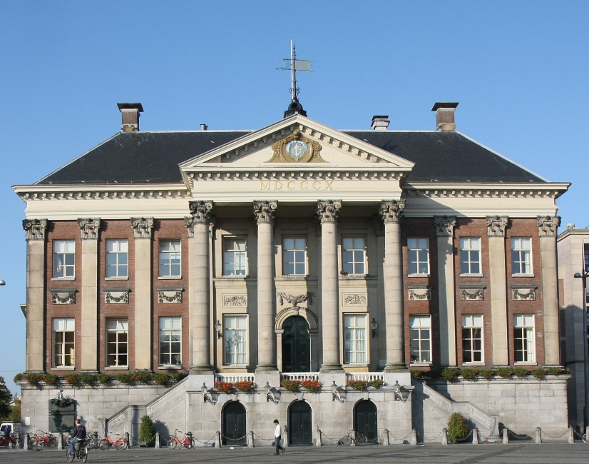 Beno Hofman: 'Een uitdijend ambtenaren-apparaat maakte al in 1869 uitbreiding noodzakelijk. Bouw van een westvleugel gaf het u-vormige gebouw toen alsnog z’n oorspronkelijk bedoelde gesloten vorm. De mogelijkheden tot uitbreiding waren daarmee op, maar hier kwam in 1945 onbedoeld verandering in. Het gebied tussen stadhuis en Guldenstraat werd in de bevrijdingsdagen letterlijk een puinhoop. De Leeuwarder architect J. Vegter kreeg opdracht iets nieuws te ontwerpen. Het gespaard gebleven Goudkantoor en een luchtbrug moesten de schakel vormen tussen het oude en nieuwe stadhuis. Ook dit keer werd de uitvoering van het plan lang opgehouden. Pas in 1962 kwam het gereed, maar nog geen dertig jaar later maakte Natalini alweer een nieuw plan.'