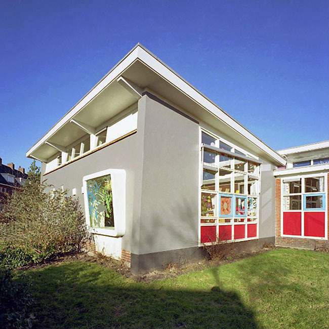 Een meerzijdige daglichttoetreding moest herschikking van het meubilair mogelijk maken zonder dat het kind hinder van de zon zou ondervinden. Door het maken van aparte werkhoeken werd de zelfwerkzaamheid bevorderd.