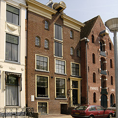 Oorspronkelijk had het pand een topgevel. Blijkens twee zandstenen neuten, links en rechts van de voordeur, werd deze in 1730 naar 18e-eeuwse inzichten vervangen door een klokgevel met grote schuiframen. De huidige zware kroonlijst en de pakhuisraampjes zijn overigens pas van 1839.