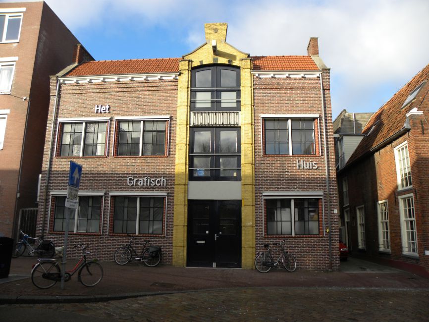 Het pand is gezet op een plattegrond van 12 meter breed aan de voorzijde en 11 meter diep en is opgebouwd uit gemetselde gevels van roodbruine gesinterde steen (voorgevel en borstwering zijgevels), rode Groninger baksteen (zijgevels) en gele klinkers (hijstravee).