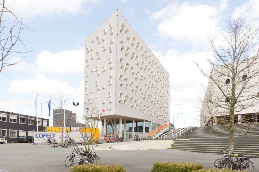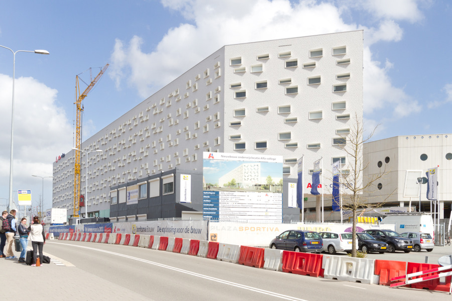Het Alfa-college aan de Boumaboulevard is de laatste schakel van het stedenbouwkundig plan van Wiel Arets voor voetbalstadion de Euroborg en de omringende bebouwing.