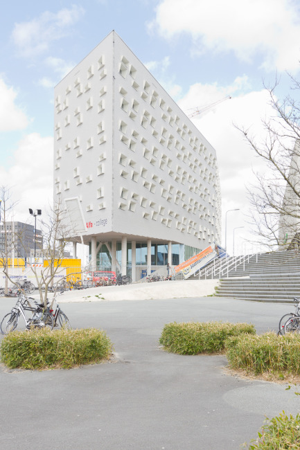 Net als het stadion is het Alfa-college een massief volume, geplaatst op een glazen ‘plint’. In die plint bevinden zich de algemene en facilitaire functies zoals een restaurant met keuken, een receptie en vergaderaccommodatie. Speciale aandacht is besteed aan de ruimtes aan de Boumaboulevard. Hier kunnen de diverse opleidingen zich presenteren, bijvoorbeeld met hun in het oog springende lesprogrammaonderdelen zoals mode, etaleren en winkelinrichting. De fietsenkelder, het archief, de repro en installaties zijn hieronder gehuisvest.