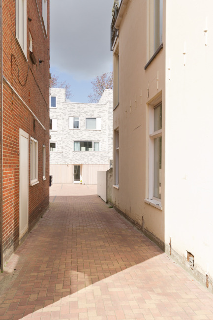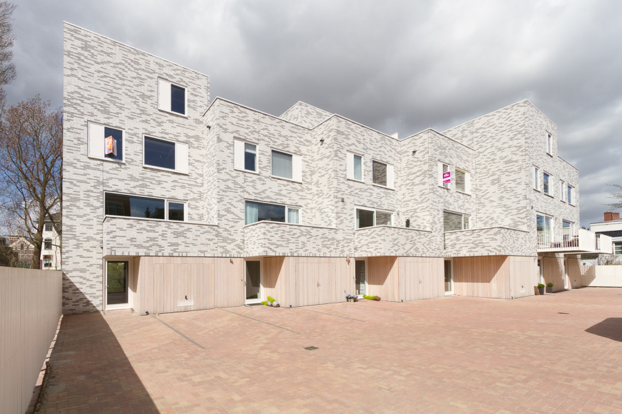 Het volume van de woningen varieert in hoogte doordat enkele woningen - tussen drie en vier lagen - een dakopbouw hebben. De kleur wit domineert; het is de terugkerende kleur van het pleisterwerk en het houtwerk van de bestaande bebouwing aan het binnengebied. De gemetselde balkons van de woningen markeren de entree en doen tevens dienst als luifel. De entreeplint van het gebouw is gemaakt van wit gebeitste verticale houten delen, waarin ook de garagedeuren zijn opgenomen.