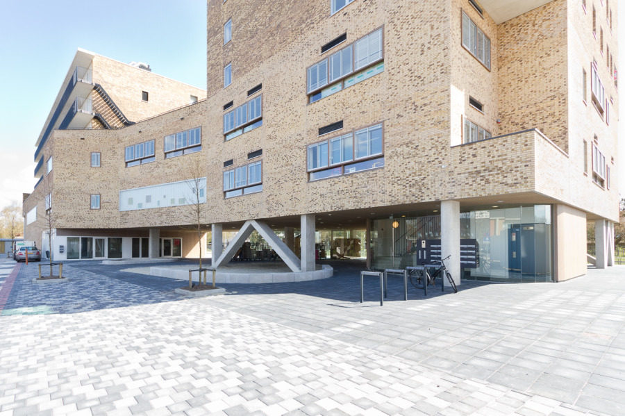 Doordat het maaiveld is opgetild en er gekozen is voor transparante entrees blijft een vrije doorkijk mogelijk. Op de begane grond bevindt zich de gymzaal. Het open gebied kan multifunctioneel worden gebruikt. Het is onder andere ingericht als speel- en sportterrein. Door het gebruik van een iets lichtere tint baksteen onderscheiden de school en de gymzaal zich van de woningen.
