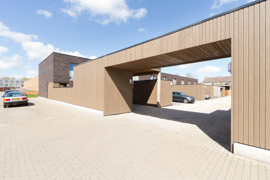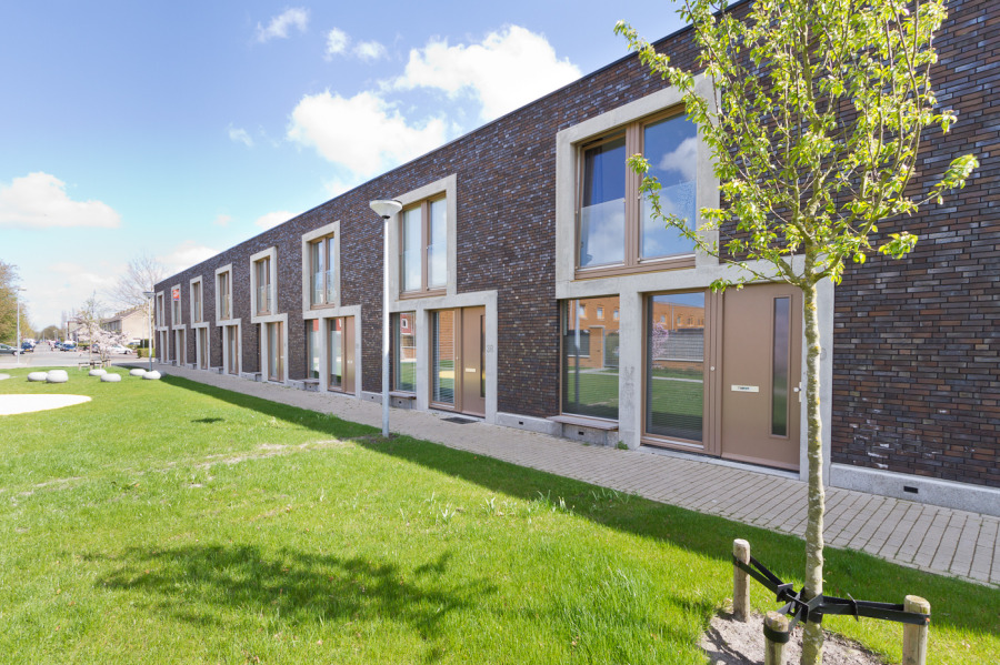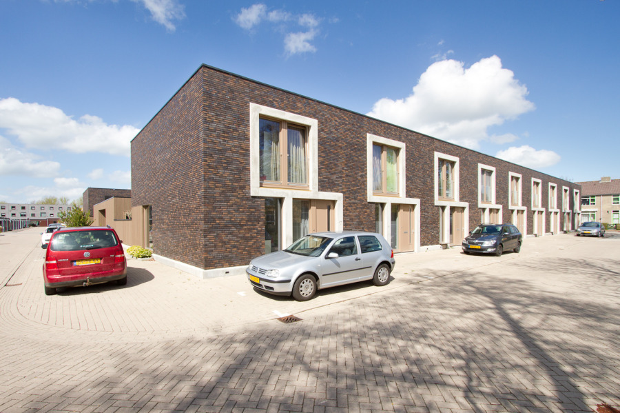 Het bouwblok is hier 90 graden gedraaid, zodat één van beide voorkanten georiënteerd kon worden op een groen speeltuinparkje. De woningen hebben elk een eigen betonnen kozijnframe dat de individuele maat in de collectieve gevel benadrukt.