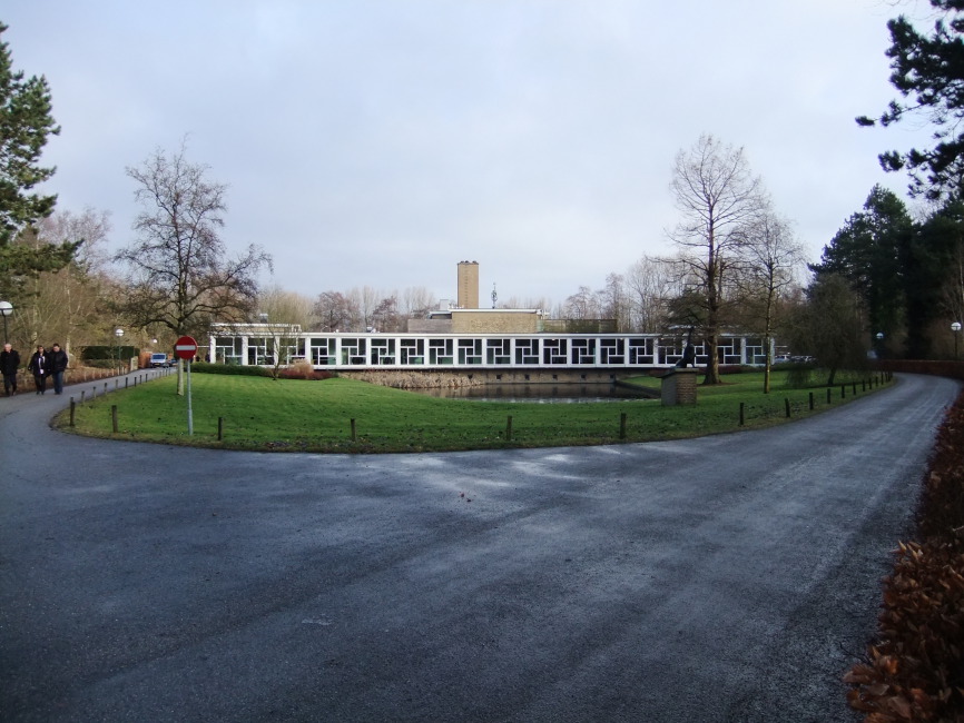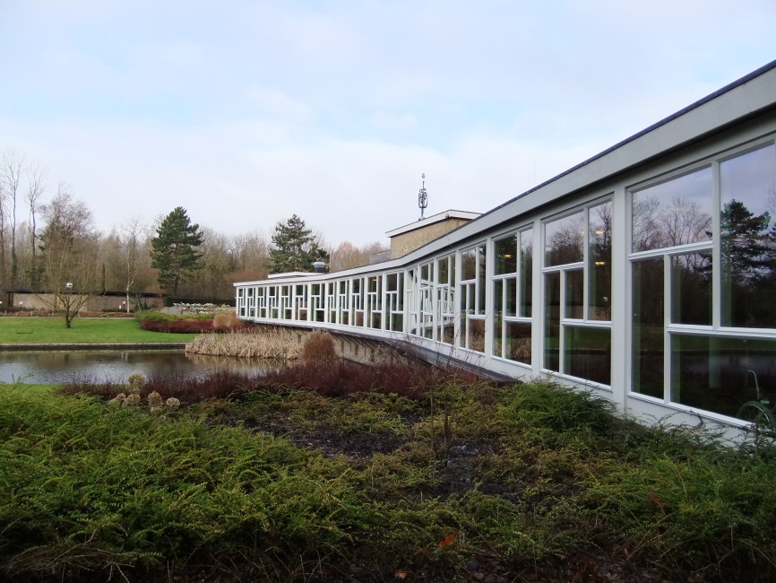 Het hoofdgebouw is ruim opgezet; het fungeerde lange tijd als het enige crematorium voor de gehele regio Noord en er moesten om die reden relatief ruime voorzieningen worden aangelegd. Het gebouw is gelegen aan een vijver met een lange, licht geknikte galerij als blikvanger.