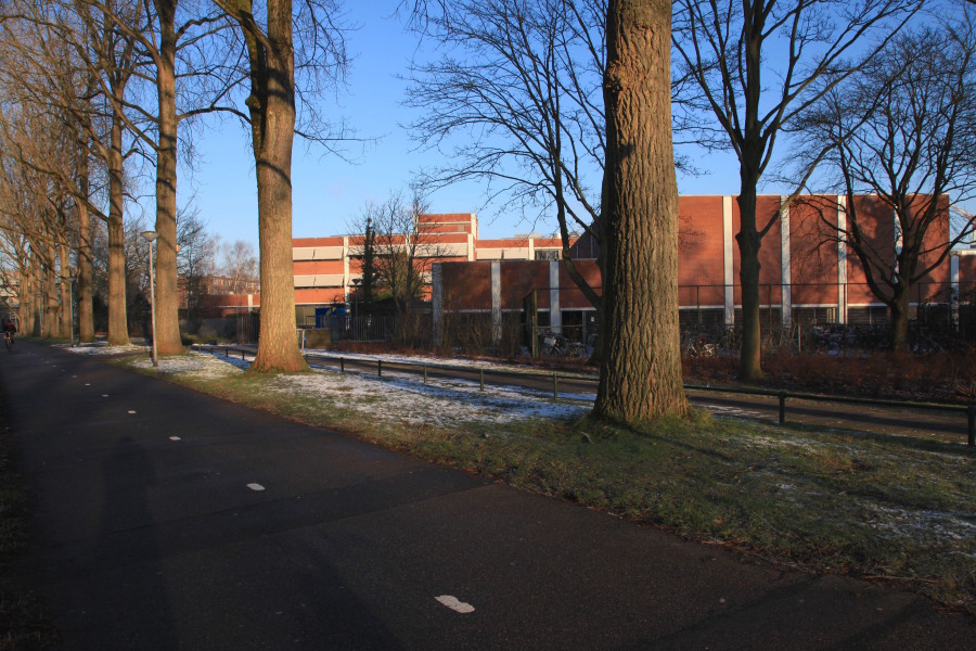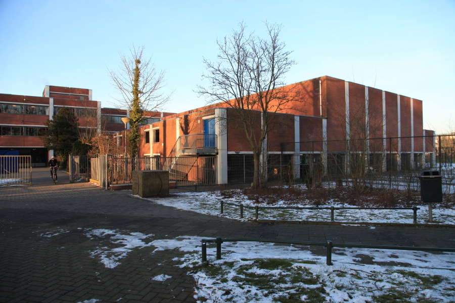 Op de begane grond bij de straathoek springt de pauzeruimte buiten het hoofdvolume. De ruimte krijgt meer hoogte door een ‘zitkuil’, maar beweegt zich nog steeds binnen hetzelfde vierkante raster. Aan de achterkant ligt een aanbouw met afwijkende verdiepinghoogten: drie gymlokalen met kleedkamers boven een lage, open fietsenstalling. Het hoofdgebouw en deze aanbouw voegen zich min of meer naar het Sleedoornpad.