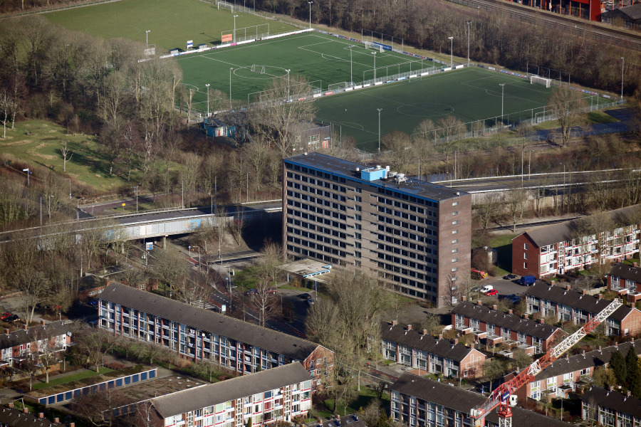 Deze hoogbouw bestaat uit tien identieke woonverdiepingen boven de begane grond. Een centraal ‘stijgpunt’ verdeelt de verdiepingen precies doormidden: links en rechts een woongroep, elk ontsloten door een middengang. Elke woongroep deelt een natte cel en een gezamenlijke woonkamer. Kamers en voorzieningen zijn opgenomen in een standaard bouwstructuur: totaal twintig beuken met een breedte van 300cm. Wanden en vloeren zijn van ter plaatse gestort beton, waardoor herindeling van het gebouw lastig is.
